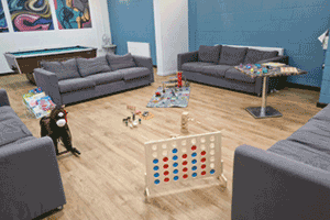 There are two rooms, one with access to a multi-use games area, sensory room, fully equipped kitchen and pool table.