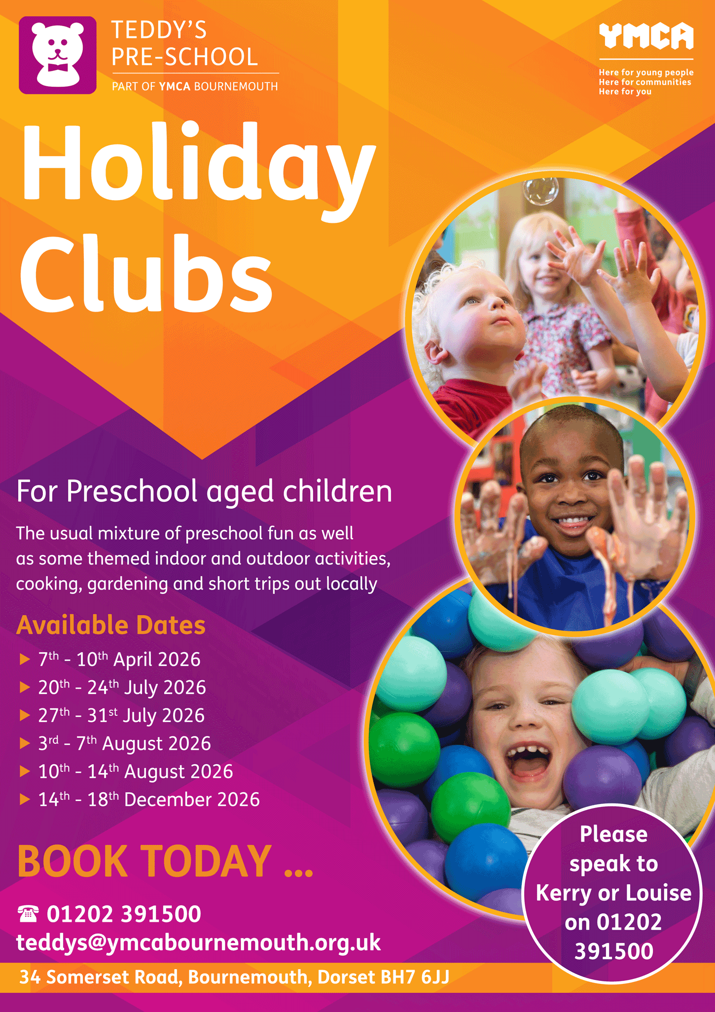 These holiday clubs are based at Teddy’s Pre-School, 34 Somerset Road, Bournemouth BH7 6JJ